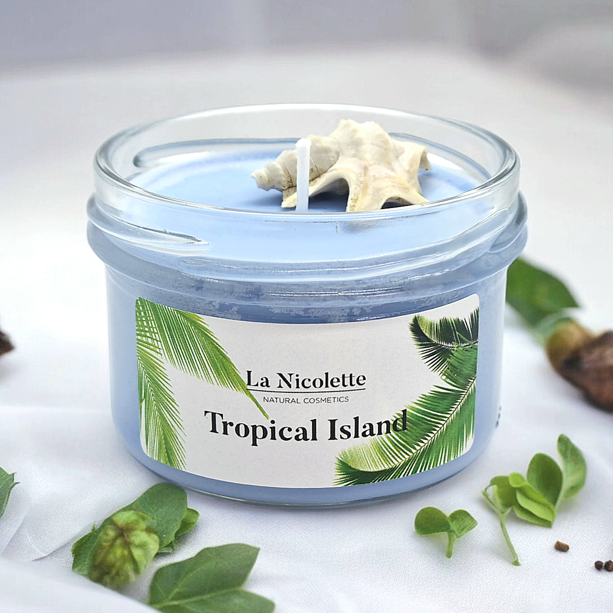 Prinesite tropsko vzdušje v svoj dom s svečko TROPICAL ISLAND, ročno izdelano iz naravnega sojinega voska. Vsaka svečka je skrbno ustvarjena, da vas popelje na oddaljene rajske plaže, kjer se vonji eksotičnega sadja, kokosa in svežega morskega vetriča združijo v popolno harmonijo.